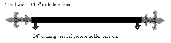 Bar - Pineapple Finial 4.25 " each leaving 24" space to hang Vertical hanging bars that hold artwork. Horizontal Mounting bar protrudes 2" out from back wall.