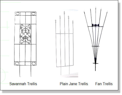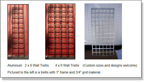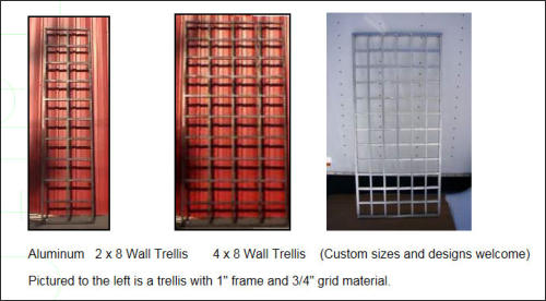 The best thing about our Metal Garden Trellises are that they look great in the Spring, Summer, Fall and Winter. Our unique aluminum trellises never rust!!! Custom designs and configurations welcome, brackets can be made at various widths and bolt together designs for large walls